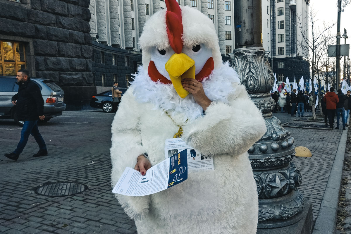 Также возле здания Кабинета министров проходит небольшой пикет, участниками которого стали люди, одетые в ростовые костюмы белых куриц. Всего их около пяти, они сообщают, что не представляют ни одну из организаций, а просто полагают, что сейчас куры в нашей стране живут лучше людей и выступают за улучшение жизни украинцев, повышение зарплат и понижение тарифов.