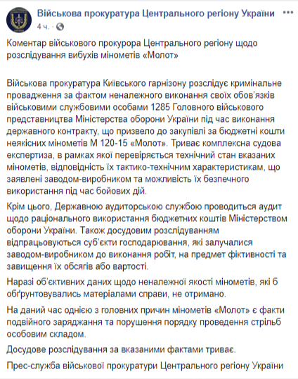 Как сообщается на странице прокуратуры в Facebооk, военная прокуратура Киевского гарнизона расследует уголовное производство по факту ненадлежащего исполнения своих обязанностей военными должностными лицами 1285 Главного военного представительства Министерства обороны Украины во время исполнения государственного контракта, что привело к закупке за бюджетные средства некачественных минометов М 120-15 "Молот".
