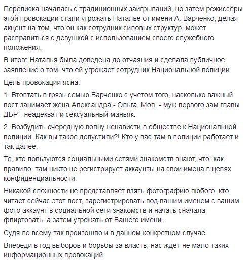 "Судя по всему, и Александр Варченко, и Наталья Бурейко, и пользователи социальных сетей стали жертвами хорошо продуманной и циничной провокации. Хакерами с использованием публичных фотографий Александра Варченко был зарегистрирован аккаунт в социальной сети знакомств. Затем было начато переписку с потенциальной жертвой - молодой симпатичной студенткой... Переписка началась с традиционных заигрываний, но потом режиссеры этой провокации стали угрожать Наталье от имени А.Варченко, делая акцент на том, что он как сотрудник силовых структур может расправиться с девушкой с использованием своего служебного положения", - рассказал нардеп.