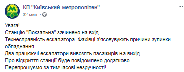"Станция "Вокзальная" закрыта на вход. Технеисправность эскалатора. Специалисты вфясняют причины остановки оборудования. Два работающих эскалатора вывозят пассажиров на выход. Об открытии станции будет сообщено дополнительно", - говорится в текста поста.