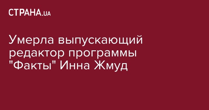 Умерла украинская журналистка Инна Жмуд. Она работала выпускающим редактором программы "Факты" на телеканале ICTV.