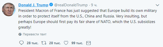 "Президент Макрон только что предложил, чтобы Европа создала свою армию, чтобы защищаться от США, Китая и России. Очень оскорбительно, но, возможно, Европе сначала нужно заплатить свою справедливую долю в НАТО, которое субсидируют США!" - написал он в Twitter.
