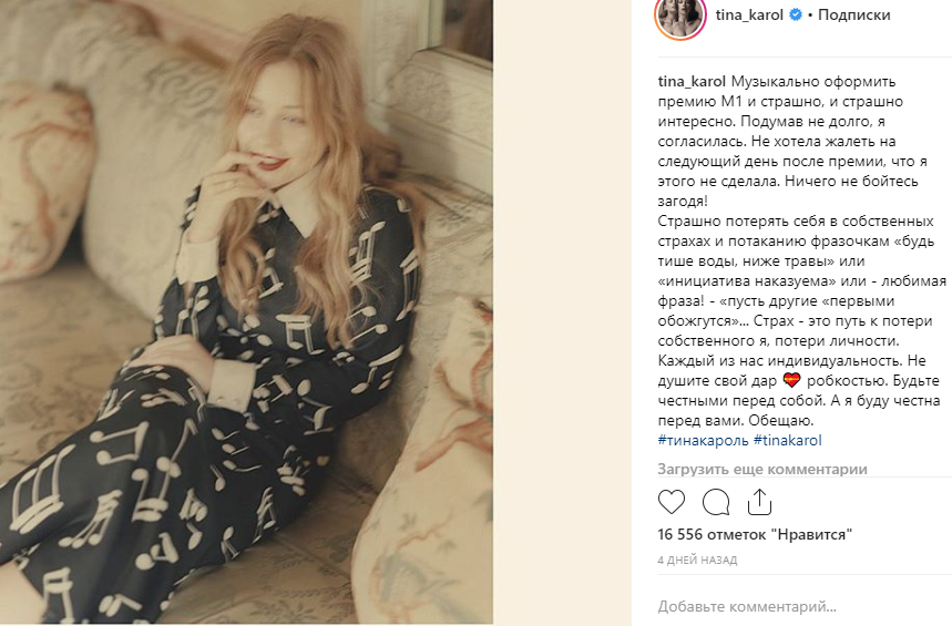 "Страшно потерять себя в собственных страхах и потаканию фразочкам "будь тише воды, ниже травы" или "инициатива наказуема" или – любимая фраза! – "пусть другие "первыми обожгутся"... Страх – это путь к потери собственного я, потери личности. Каждый из нас индивидуальность. Не душите свой дар робостью. Будьте честными перед собой. А я буду честна перед вами. Обещаю", – пишет Тина.