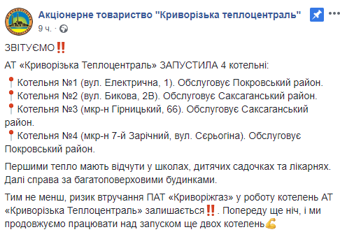 В сообщении перечислены котельные, которые уже заработали в Кривом Роге: