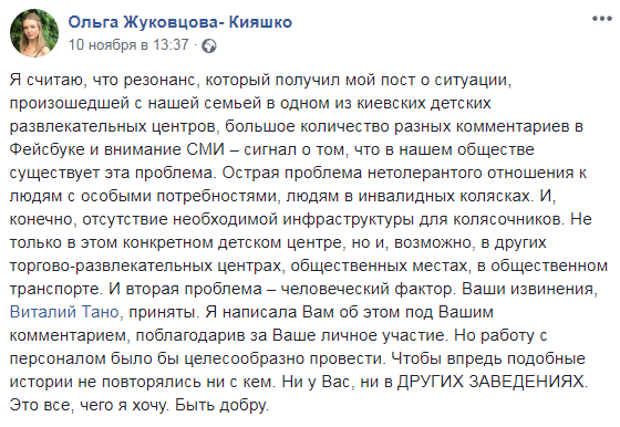 "Я считаю, что резонанс, который получил мой пост о ситуации, произошедшей с нашей семьей в одном из киевских детских развлекательных центров, большое количество разных комментариев в Фейсбуке и внимание СМИ – сигнал о том, что в нашем обществе существует эта проблема. Острая проблема нетолерантого отношения к людям с особыми потребностями, людям в инвалидных колясках. И, конечно, отсутствие необходимой инфраструктуры для колясочников.