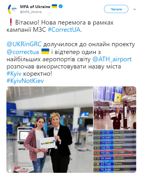 По данным МИД, отныне один их крупнейших аэропортов мира Athens Airport (Афины, Греция) начал использовать корректное название украинской столицы "Kyiv".