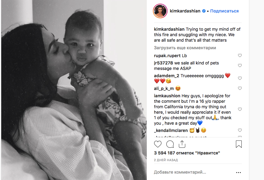Звезда соцсетей Ким Кардашьян и ее семья тоже успели уехать из своего дома в Калабасасе, собрав вещи всего за час. После этого Ким запостила фото с племянницей, написав: "Мы все в безопасности, и это все, что имеет значение".