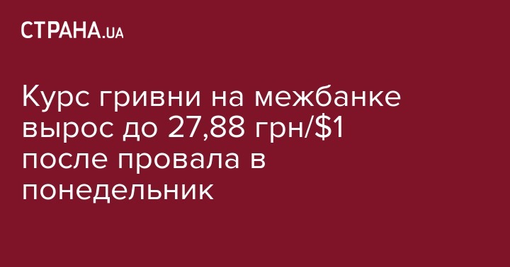 Курс гривни на межбанке вырос до 27,88 грн/$1 после провала в понедельник