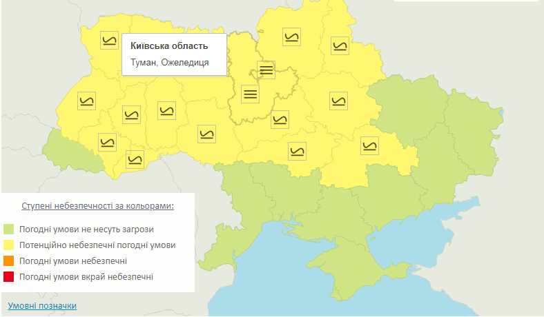 Отмечается, что такая ситуация может продержаться 3 часа и более. Также в Укргидрометцентре предупредили о гололеде.