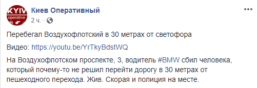 На Воздухофлотском проспекте, 3, ночью 11 ноября водитель BMW сбил человека, который почему-то не решил перейти дорогу в 30 метрах от пешеходного перехода. Об этом сообщает Киев оперативный в Facebook.