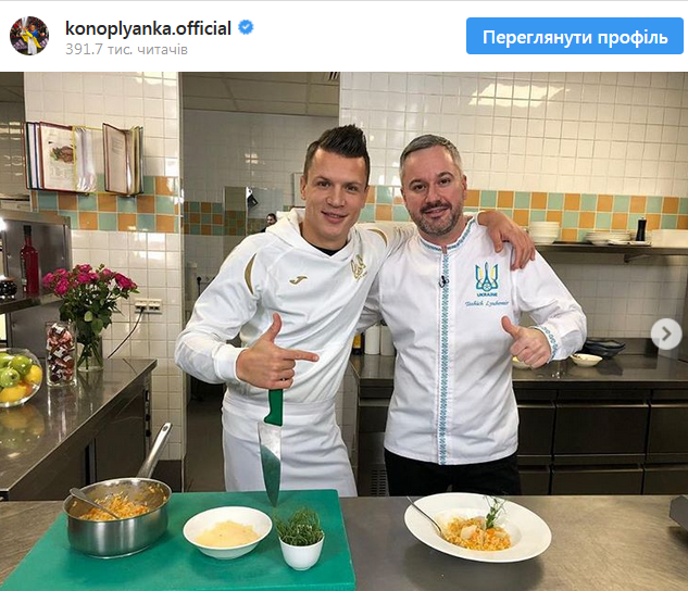 Полузащитник немецкого Шальке и сборной Украины Евгений Коноплянка попробовал себя в новой роли. Так, игрок взял кулинарный урок у повара сборной Украины Любомира Тошича. Коноплянка облачился в поварский халат и на пару с профессионалом приготовил вкусное блюдо.