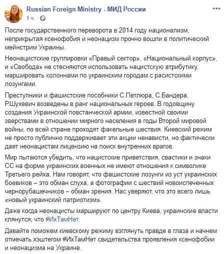 В МИД РФ утверждают, что "Правый сектор", "Национальный корпус" и "Свобода" являются "неонацистскими группировками", которые "маршируют колоннами по украинским городам с расистскими лозунгами". Суть флешмоба заключается в том, чтобы, как сказано в сообщении российского министерства, "отмечать хэштегом #ИхТамНет свидетельства проявления ксенофобии и неонацизма на Украине".