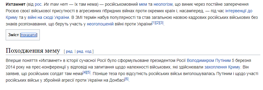 Отметим также, что хэштег #Ихтамнет с 2014 года использовался для обозначения присутствия российских военных на территории Украины из-за постоянного отрицания властями РФ данного факта. Об этом идет речь в статье на украинской "Википедии".