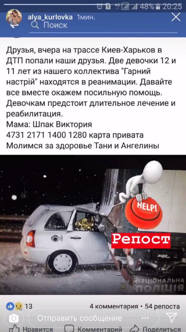 "Мы такие же дети, как и ты, и думаем так: если каждый из нас откажется от какой-то новой вещи, с нами ничего не случится, мы будем жить дальше. А для Тани и Ангелины (пострадавшие девочки - Прим.Ред.) эти деньги - жизненная необходимость. Поэтому не будьте равнодушны. И помогите спасти жизнь", - говорится в обращении детей из коллектива "Гарний настрій", которые зовут всех прийти на благотворительный концерт и помочь двум нуждающимся в помощи маленьким девочкам.