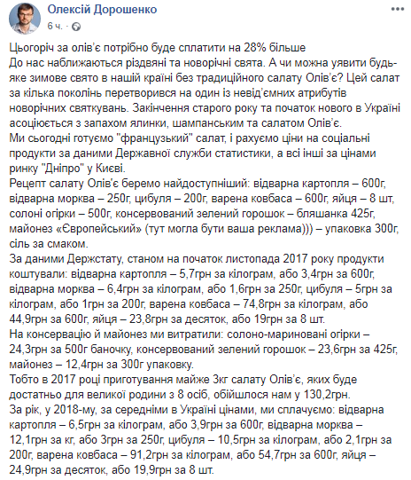 "В 2017 году приготовление почти 3 кг салата "Оливье", которых будет достаточно для большой семьи из 8 человек, обошлось бы в 130,2 грн", - написал Дорошенко.