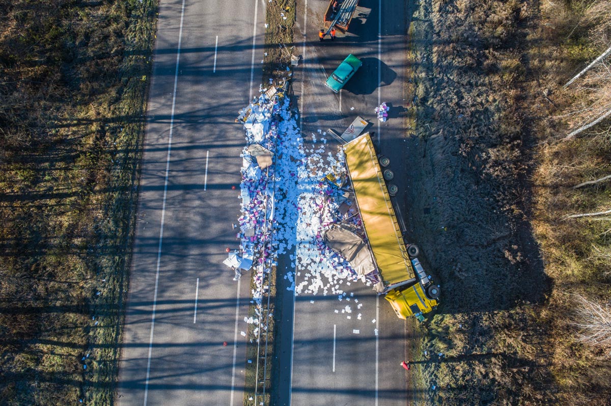 В пятницу, 16 ноября, на 76-м километре Житомирской грузовик DAF снес несколько метров отбойника и перевернулся. Машина, которая везла офисную бумагу, перевернулась поперек дороги, вследствие чего движение по части трассы оказалось перекрыто. Авария произошла около 6:20. Информатор сфотографировал с высоты перевернутый посреди дороги тягач.