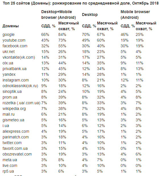 На первом месте в рейтинге наиболее посещаемых доменов оказался Google. Также в первую пятерку вошли сайты Youtube, Facebook, Ukr.Net и "Вконтакте". Среднедневная доля аудитории за месяц сайта Google составила 66%, а месячный охват аудитории – 84%.