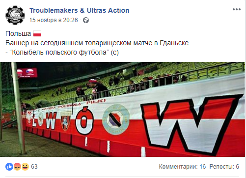 Украинские поклонники футбола не остались у них в долгу и уже на следующий день, 16 ноября, во время игры против сборной Словакии в Лиге наций (1:4), они вывесили украинский флаг с изображением нашего герба и названием польского города Хелм. Они, очевидно, напоминали фанатам сборной Польши, что и часть их территории когда-то была в составе Галичины.