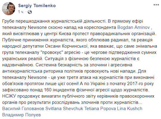 "Публичное унижение журналиста, которого оплевал радикал, и реакция народного депутата Оксаны Корчинской, которая считает, что именно съемочная группа телеканала "провоцирует" агрессию - это очередное подтверждение печальных украинских реалий. Ситуация с физической безопасностью журналистов является чрезвычайной. Системная безнаказанность за преступления и агрессивная антижурналистская риторика политиков провоцируют новые нападения. Для телеканала Newsone - это уже третья атака на журналистов при исполнении обязанностей в течение этой осени. А по Украине с начала 2017 года зафиксировано более 160 инцидентов физической агрессии в отношении журналистов. НСЖУ продолжает требовать публичного отчета руководителей правоохранительных органов о результатах расследований преступлений против журналистов", - написал Сергей Томиленко в Facebook.