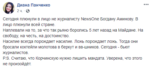 "Сегодня плюнули в лицо не журналисту NewsOne Богдану Аминову. В лицо плюнули всей стране. Наплевали на то, за что так рьяно боролись 5 лет назад на Майдане. На свободу, на честь, на достоинство. Насилие всегда порождает насилие. Ложь порождает ложь. Тогда они бросали коктейли молотова в беркут и вв-шников. Сегодня - бьют журналистов. P.S. Считаю, что Корчинскую нужно лишить мандата. Уверена, что этого не произойдёт", - написала телеведущая.