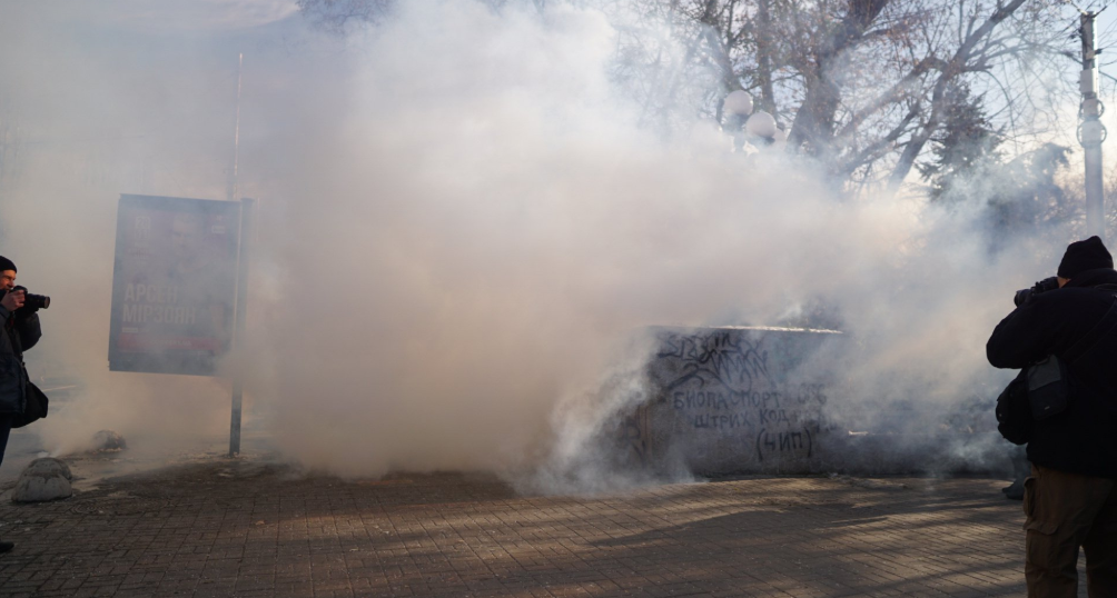 Противники марша начали бросать дымовые шашки, в том числе на дорогу, распылять газовые баллончики. А также скандировать "Слава нации — смерть врагам!" и "Украина превыше всего!"