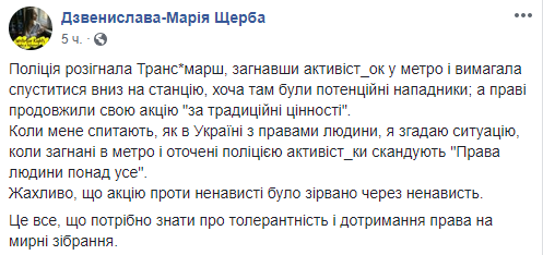 "Полиция разогнала Транс марш, загнав активистов в метро, и требовала спуститься вниз на станцию, хотя там были потенциальные нападавшие; а правые продолжили свою акцию "за традиционные ценности". Когда меня спросят, как в Украине с правами человека, я вспомню ситуацию, когда загнанные в метро и окруженные полицией активисты скандируют "Права человека превыше всего". Ужасно, что акция против ненависти было сорвана из-за ненависти. Это все, что нужно знать о толерантности и соблюдения права на мирные собрания".