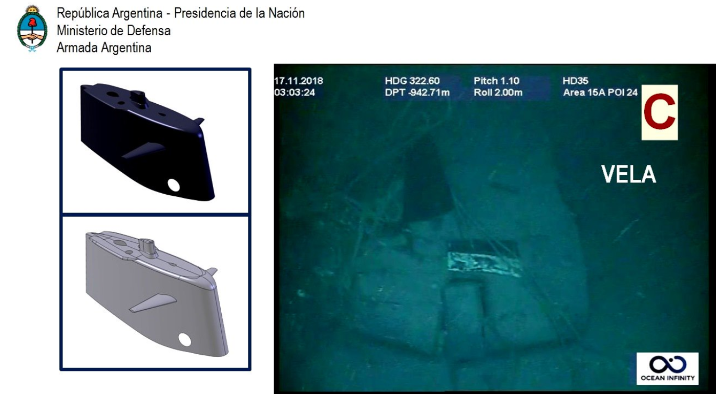 Командование ВМС Аргентины приняло решение опубликовать в Twitter первые фотографии затонувшей субмарины. На кадрах видно разрушенный мощным взрывом корпус подлодки. Также гребной винт субмарины лежит отдельно от корпуса.