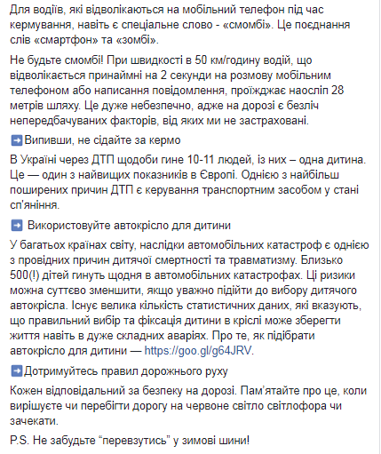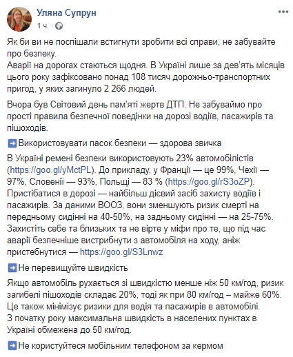 Исполняющая обязанности министра здравоохранения Ульяна Супрун после Всемирного дня памяти жертв ДТП решила напомнить украинцам о правилах, которые должны соблюдать водители, чтобы не попасть в ДТП. Перечень рекомендаций она опубликовала на своей странице в Facebook.