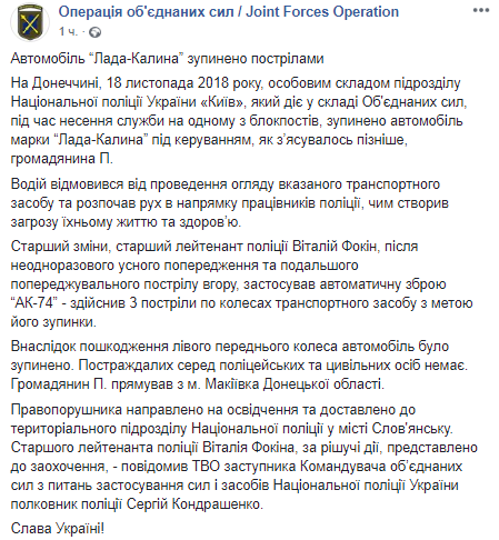 Так, речь идет о том, что остановили нарушителя сотрудники подразделения Национальной полиции Украины "Киев", который действует в составе Объединенных сил. Водитель автомобиля "Лада-Калина" не захотел останавливать свою машину для осмотра, более того, он начал движение в направлении сотрудников полиции, что строго запрещено.