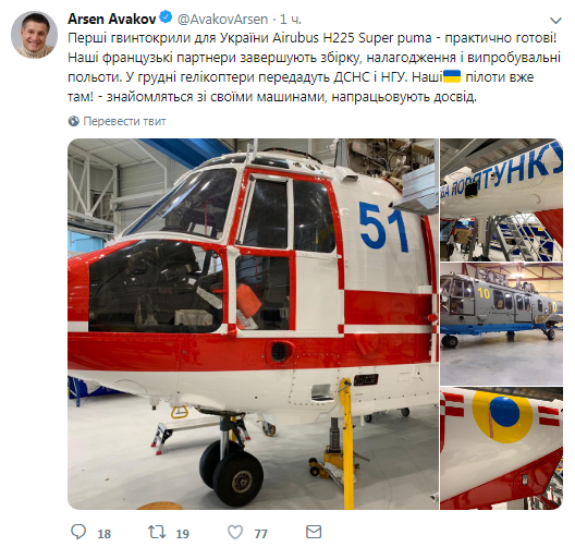 Уже в декабре 2018 года ГСЧС и Нацгвардия Украины получат первые "вертолеты Авакова", контракт на приобретение которых был подписан еще летом. Об этом сообщил министр внутренних дел Украины Арсен Аваков на своей странице в Twitter.