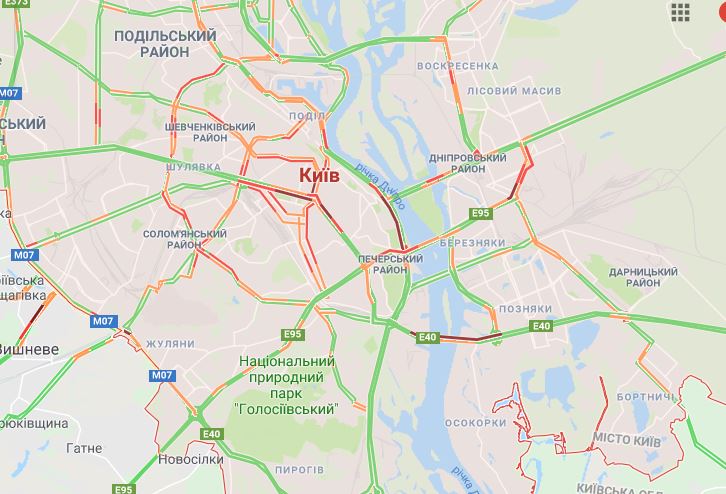 В Киеве сегодня, 20 ноября, по состоянию на 12:45 из-за акции евробляхеров и непогоды наблюдаются пятибалльные пробки. Об этом свидетельствуют данные Googl Maps.