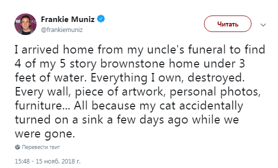 Американский ведущий программы "Танцы со звездами: юниоры" Фрэнки Муниз потерял все нажитое имущество из-за своей кошки. Об этом он написал в своем Twitter.