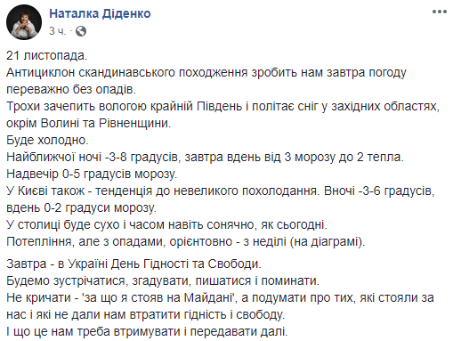 В Украине в среду, 21 ноября, ожидается холодная погода в большинстве областей, но без осадков. На Закарпатье, Прикарпатье и крайнем юге будет падать мокрый снег. Температура воздуха в среднем составит -2...+3 градуса. Об этом сообщает синоптик Наталья Диденко на своей странице в Facebook.