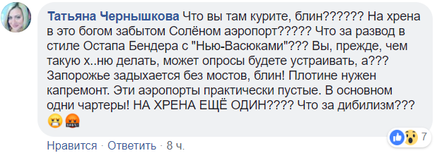 "Расстояние между Запорожьем и Днепром около 100 км. Зачем туда тулить 3 аэропорт... Вы считаете,что запорожцы будут улетать с аэропорта другого, вместо своего,который находится в черте города? Не хотите ли вы достроить мост в городе Запорожье, который начался строится в 2004 году? Он не построился ни при Кучме, ни при Ющенко, ни при Януковиче, кто там еще был ио Турчинов, и вот при Порошенко с 2014 года он почему то тоже не строится.... Как вы думаете люди живущие в этом городе пойдут голосовать за нынешнего президента и всю его команду? Серьезно? Вы правда считаете, что нам нужны аэропорты в прямом смысле через каждые 50 км? С неадекватными ценами на ВСЕ, повышающейся коммуналкой, с разрушающимися домами, отсутствием дорог и мостов? Вы серьезно считаете,что люди идиоты?", - пишет жительница Запорожья Наталья Яхнина.