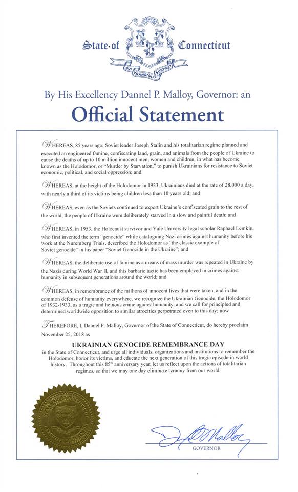 Сообщается, что 21 ноября штат Коннектикут признал Голодомор в Украине 1932-1933 годов геноцидом украинского народа, губернатор штатат Дэниэл Мэллой подписал соответствующую прокламацию. Ее пресс-служба посольства прилагает к публикации.