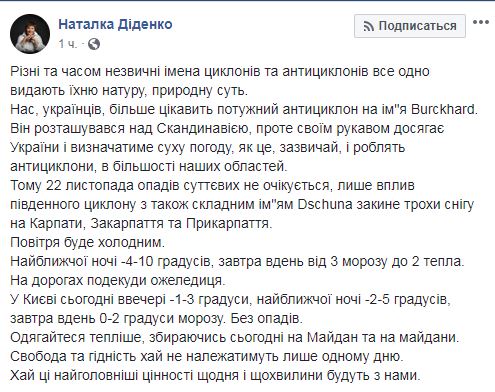 "Одевайтесь теплее, собираясь сегодня на Майдан и майданы. Свобода и достоинство пусть не будут принадлежать лишь одному дню. Пусть эти самые главные ценности ежедневно и ежеминутно будут с нами", - резюмировала Диденко.