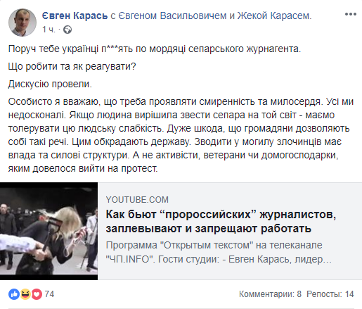 "Рядом с тобой украинцы п***ят по мордяке сепарского журнагента. Что делать и как реагировать?.. Лично я считаю, что надо проявлять смирение и милосердие. Все мы несовершенны. Если человек решил свести сепара на тот свет – должны терпеть эту человеческую слабость", – написал Евгений Карась в подводке к эфиру "Магнолии-ТВ" на своей странице в Facebook.