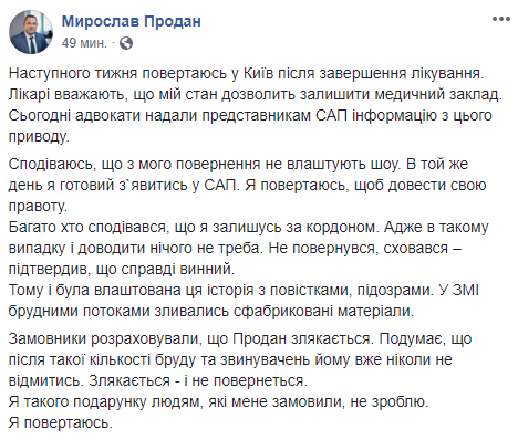 "На следующей неделе возвращаюсь в Киев после завершения лечения. Врачи считают, что мое состояние позволит покинуть медицинское учреждение. Сегодня адвокаты предоставили представителям САП информацию по этому поводу. Надеюсь, что из моего возвращения не устроят шоу. В тот же день я готов появиться в САП", - написал Продан на своей странице в соцсети Facebook в среду.