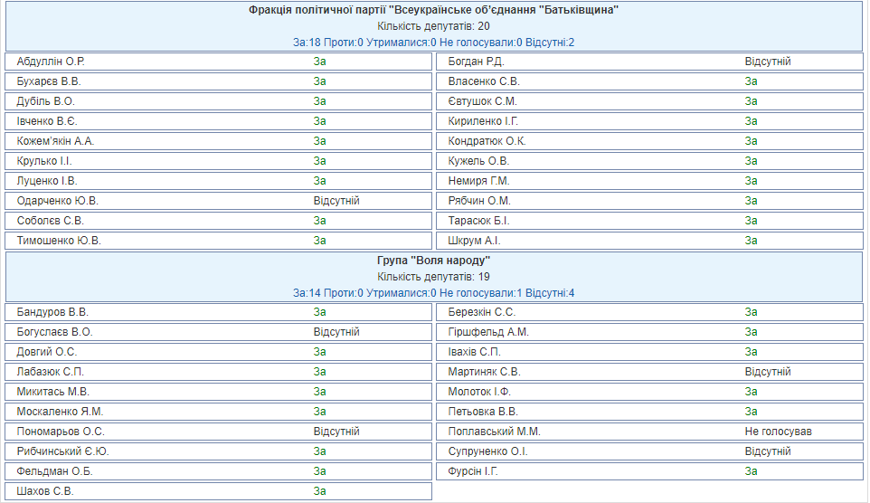 На сайте Рады появился список проголосовавших. Известно, что в БПП проголосовали 124 депутата. В Народном фронте - 73, среди внефракционых сразу 33 депутата из 60 поддержали инициативу. Оппозиционный блок проголосовал против.