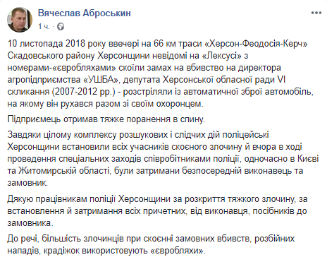22 ноября в Киеве и Житомирской области правоохранители задержали заказчика и исполнителя покушения на директора агропредприятия, депутата Херсонского областного совета VI созыва Андрея Федоренко, чью машину обстреляли 10 октября на 66 км трассы "Херсон-Феодосия-Керчь". Об этом написал заместитель руководителя Национальной полиции Украины Вячеслав Аброськин на своей странице в Facebook.