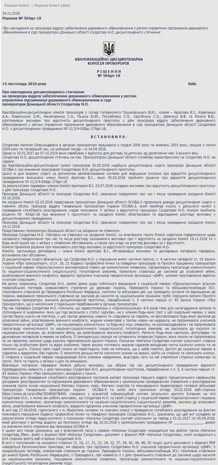 Изначально член КДКП Архипов составил вывод об отсутствии дисциплинарного проступка в действиях прокурора Солдатовой. Он учел ее письменные объяснения, что страницу в "Одноклассниках" завела давно, но ничего там в последнее время не постила и кто там мог понаставлять "лайков" под пропагандистскими публикациями понятия не имеет.
