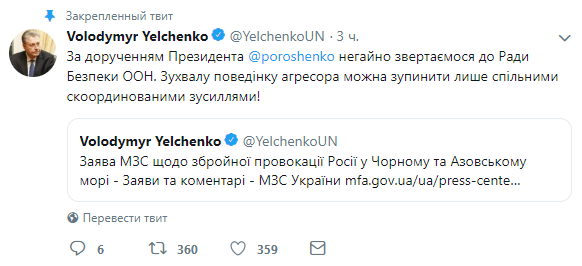 "По поручению президента немедленно обращаемся в Совет безопасности ООН. Вызывающее поведение агрессора можно остановить только совместными скоординированными усилиями!" - написал он.
