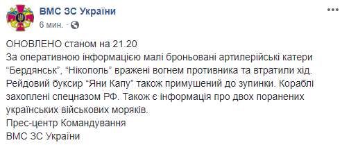 "Малые бронированные артиллерийские катера "Бердянск", "Никополь" были поражены огнем противника и потеряли ход. Рейдовый буксир "Яны Капу" также принужден к остановке. Корабли захвачены спецназом РФ. Также есть информация о двух раненых украинских военных моряках", - говорится в сообщении.