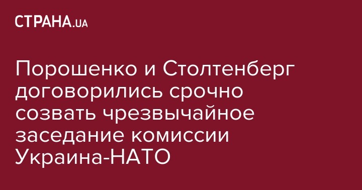 Президент Украины Петр Порошенко и генеральный секретарь НАТО Йенс Столтенберг в ходе телефонных переговоров пришли к единому решению о срочном созыве чрезвычайного заседания комиссии Украина-НАТО из-за агрессии Российской Федерации. Об этом сообщает пресс-служба главы государства.