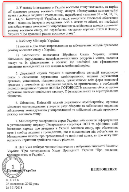 В этом пункте перечислены права граждан, которые ограничиваются указом. В документе, который раздали депутатам, нарушены 12 конституционных прав украинцев.