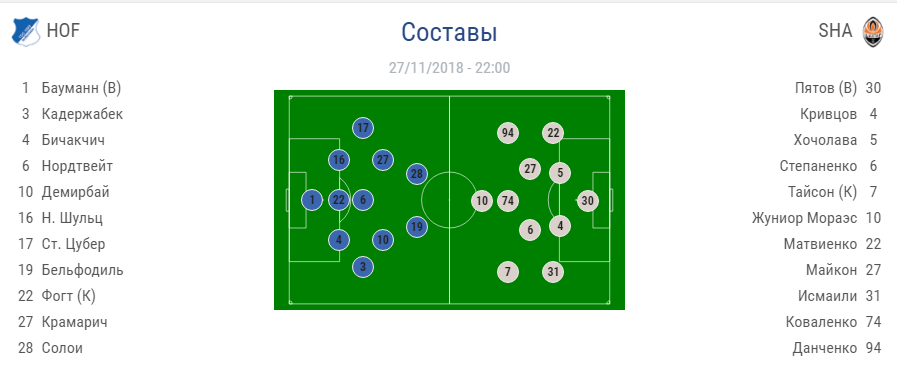 84 Две замены у "Хоффенхама" и вторая замена у "Шахтера". У нашей команды Степаненко ушел отдыхать, его заменил атакующий полузащитник Дентиньо.