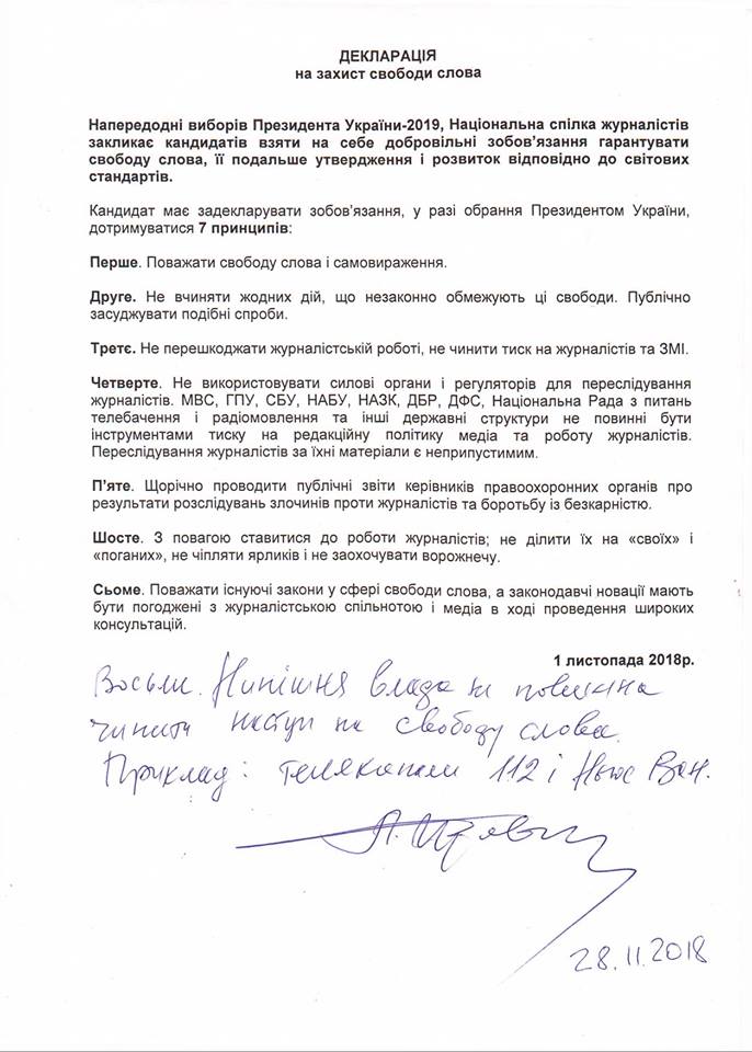 С инициативой Декларации выступили в НСЖУ. Документ предусматривает, что претенденты на пост президента Украины берут на себя добровольные обязательства уважать свободу слова и самовыражения, не оказывать давление на журналистов и СМИ, не использовать силовые органы для преследования журналистов, проводить публичные отчеты о расследовании правонарушений против работников СМИ.