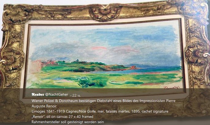 В понедельник, 26 ноября, в Вене из аукционного дома похищена картина "Залив, море, зеленые скалы" французского импрессиониста Пьера Огюста Ренуара.