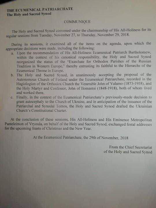 "В контексте ранее принятого решения Вселенского патриархата предоставить автокефалию Украинской церкви, и в ожидании выдачи Патриаршего и Синодального Томоса, святой и священный Синод подготовил устав Украинской церкви".