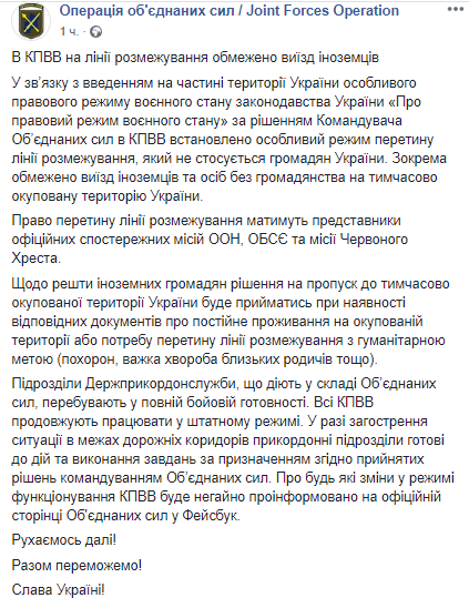 Указано, что в связи с введением на части территории Украины особого правового режима военного положения по решению командующего Объединенных сил Сергея Наева на КПВВ установлен особый режим пересечения линии разграничения, который не касается граждан Украины.